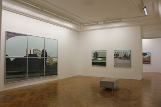 L’écho au photographique se manifeste encore d’une autre façon : tout comme le monde semble toujours se donner « derrière la vitre », esquivé par les images que l’on se fait de lui, les images qui nous habitent, chaque peinture se donne à voir derrière un plexiglas qui en plus de manifester cette séparation, impose une texture lisse propre à l’image photographique. Le spectateur confronté à ses reflets est amené à se déplacer dans l’espace comme j’ai déambulé à la recherche d’une « vue » et enfin il n’est plus ce cyclope immobile figé par la contemplation d’un théâtre.