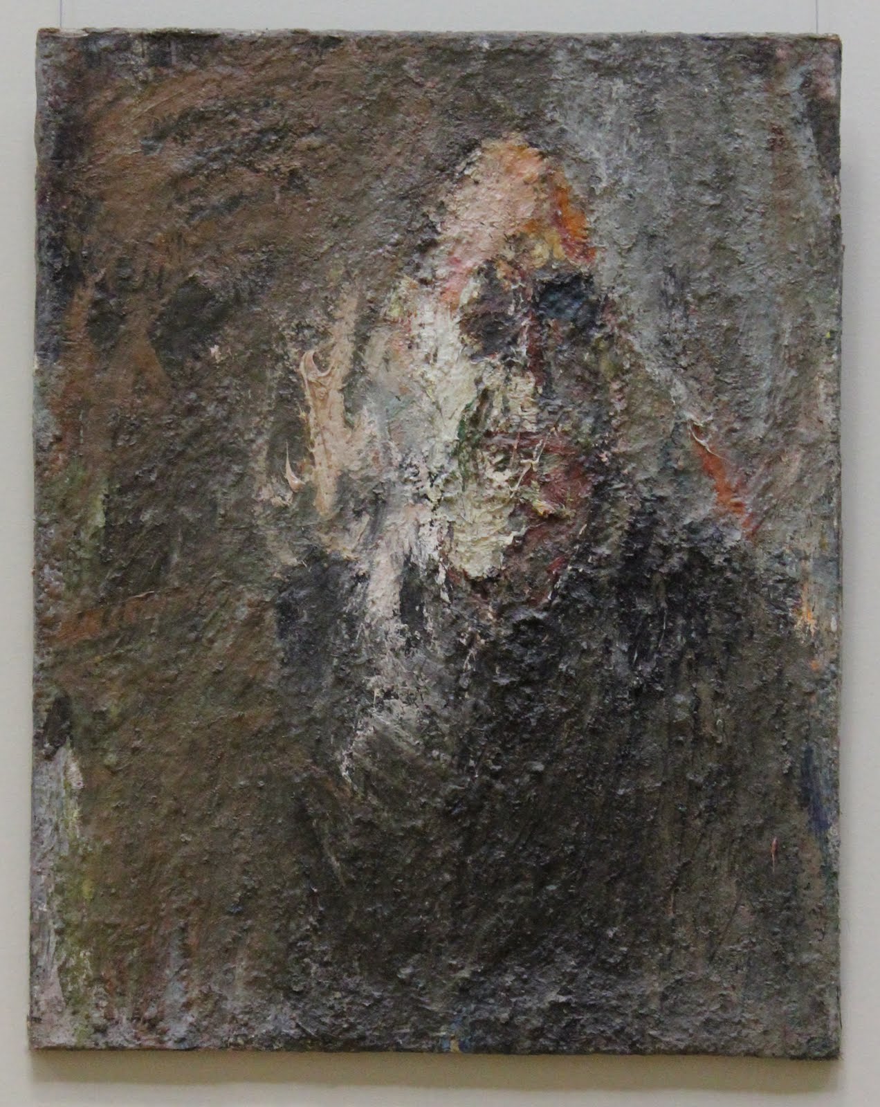 C’est singulièrement « grouilleux » pour tout dire, un mot qu’on s’est inventé faute de mieux sur l’instant, imposant les mots « grouillant » et « pâteux », « boueux » un peu. La peinture épaisse est montée en excès, presque écœurante. On pourrait dire : une croute. On fouille des yeux cette espèce de champ de bataille flegmatique, comme plombé de couleurs rabattues, confuses, on n’y distingue rien, à peine si on y voit. Chaque touche, empâtée, est fondue en une autre, et dans une autre encore en un désastre comme une mer qui bientôt efface, individuelles, toutes les vagues qui la composent. (j’avais déjà raconté ça ici) Les teintes surajoutées ne laissent généralement plus voir qu’un magma indéfinissable, brunâtre, duquel émergent distraitement quelques touches variées. Dans un recul on tente pourtant de faire apparaitre ce que le titre vous suggère. Ou à défaut de titre, un étrange désir de figuration qui s’exerce sournoisement sur tout ce qui s’offre au regard – il faudrait bien y distinguer pour pouvoir saisir ce qui sinon échappe dans l’indéterminé. Mais jamais alors, le sujet ne s’impose en se détachant distinctement. Plutôt le peintre fait venir le fond au devant du sujet, le contaminant, le noyant bientôt dans une pâte épaisse comme la multitude des regards lancés à palper le monde. L’un n’est pas par-dessus l’autre. Là où Giacometti cherche et bute au monde, émaciant ses visages, enlevant la matière jusqu’à rencontrer au fond de tous l’extrémité du squelette, Eugène Leroy cherche ce même point de contact en surchargeant la toile, accumulant comme pour toucher mais sans y parvenir. Il peint l’excédance du monde et sa disparition dans cette excédance même. Alors, ce qui fascine – et touche finalement – dans ces tableaux rustres et lourds c’est ce phénomène d’éclipse, l’identité en péril de ce que l’on croit pouvoir distinguer avant de convenir que cela déjà n’est plus. Cette épaisseur, c’est l’épaisseur du temps, des moments, des aspects, de laquelle sourd comme une permanence ultime, nettoyée, un corps, des fleurs en fagot ou plus souvent une tête qui comme chez Giacometti, puisque leurs différences au bout du compte les rapprochent, laisse percevoir son crâne.