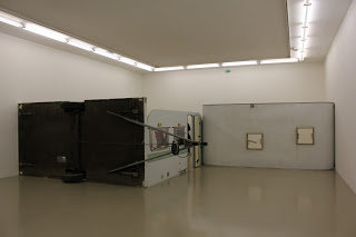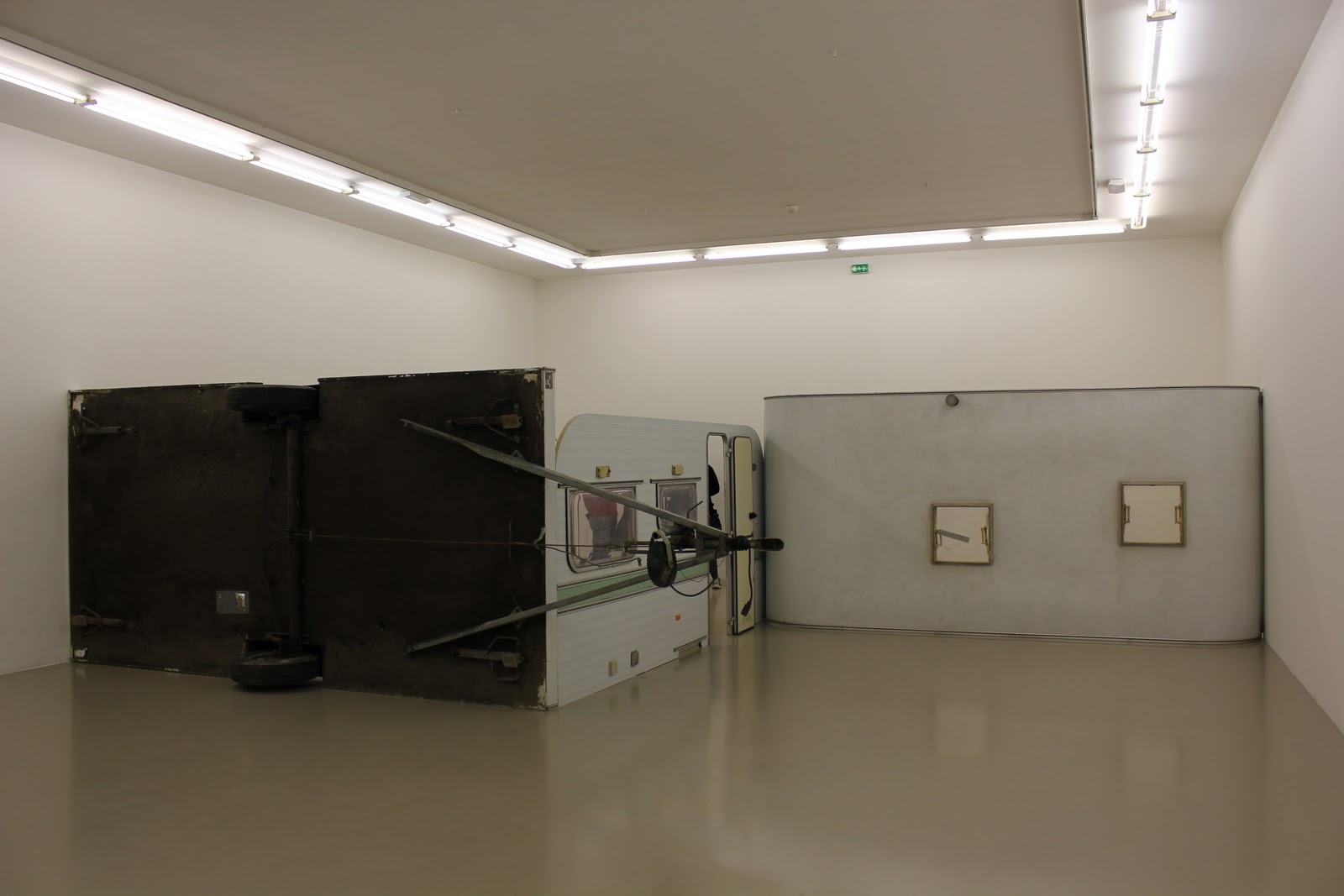 D’abord l’entrée de l’exposition est encombrée par la carcasse d’une caravane