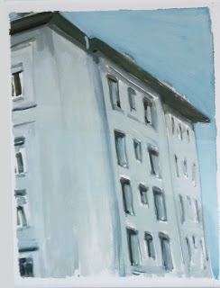 Est-ce l’immeuble qui bascule dans le bleu ou le bleu qui tient l’immeuble? N’est-ce pas d’ailleurs le regard qui bascule – et l’horizon avec -?